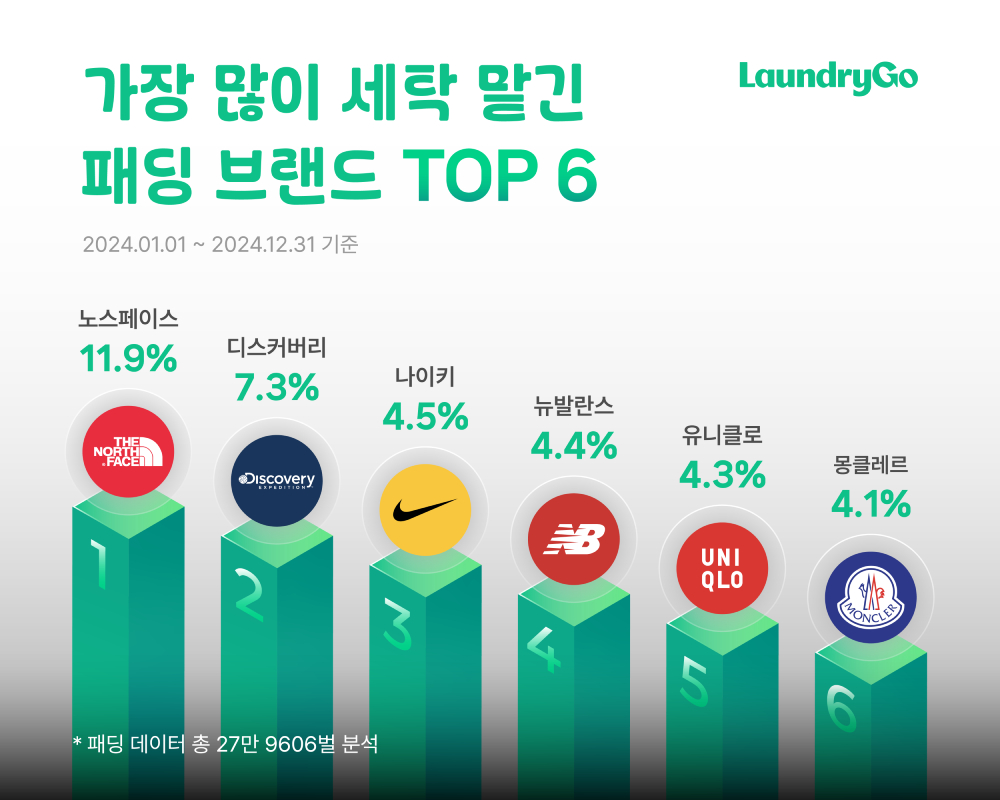 런드리고가 지난 한 해 동안 세탁한 패딩 27만9606벌을 분석한 결과, 가장 많이 세탁된 브랜드는 ▲노스페이스(11.9%) ▲디스커버리 익스페디션(7.3%) ▲나이키(4.5%) 순으로 나타났다. 아웃도어 브랜드가 강세를 보이는 가운데 유니클로(4.3%)가 5위에 오르며 실속형 소비 경향도 드러났다.
