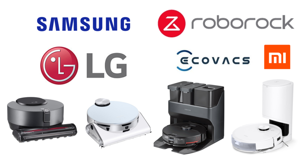 IoT 기술로 무장한 우리나라의 삼성전자, LG전자의 로봇청소기(좌)에 비해 중국의 로보락, 에코백스 로봇청소기(우)는 '올인원' 기능에 특화돼 있다. (이미지=각사)