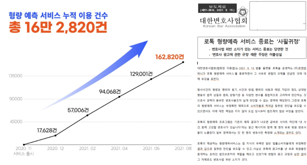 로톡은 일단 지난해 국내 최초로 선보인 ‘형량예측 서비스’를 중단했다. ‘변호사 등이 아님에도 수사기관과 행정기관의 처분∙법원 판결 등의 결과 예측을 표방하는 서비스를 취급∙제공하는 행위’를 하는 개인∙법인∙기타단체에게 광고∙홍보∙소개를 의뢰하거나 참여 또는 협조하지 못하도록 한 변협의 개정 광고 규정을 고려한 조치다.