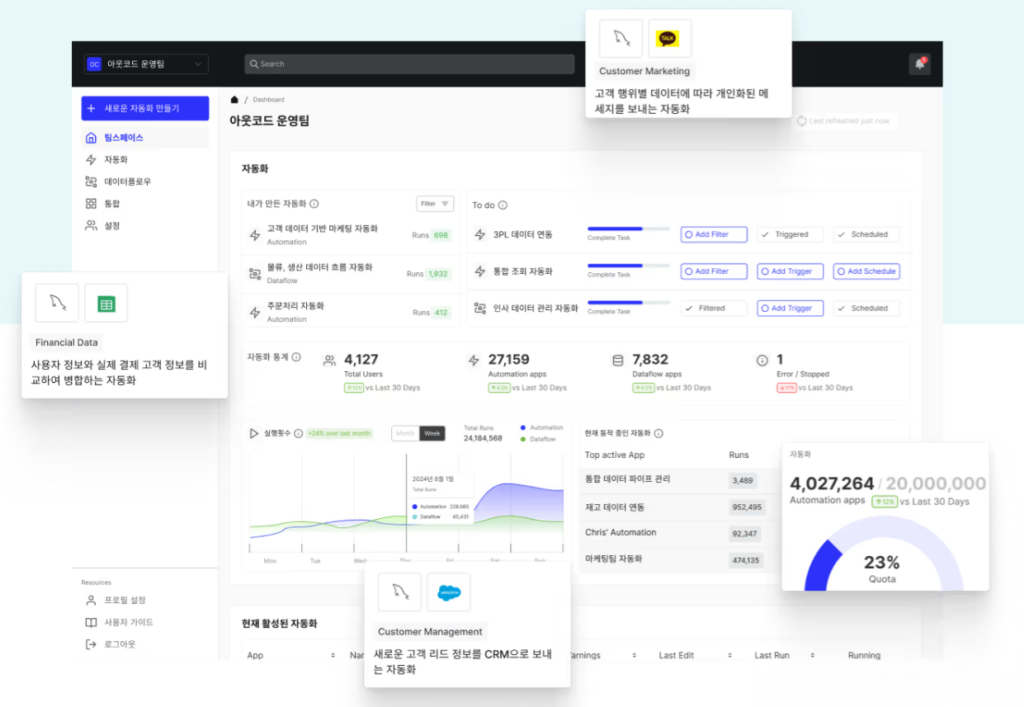 아웃코드는 이 각각의 영역에서 기업의 워크플로우에 맞게 데이터를 모으고 활용할 수 있도록 하는 자동화 기능을 쉽게 만들 수 있도록 돕는다. 이러한 상황에서 개발 지식이 없이도 누구나 활용할 수 있는 노코드의 장점은 빛을 발한다.