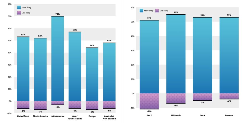 아울러MZ세대 중 52%는 새로운 직업을 고려하고 있는 것으로 나타났다. 나아가 근무방법, 장소, 시간 등에도 변화가 있는 것으로 조사됐다. 마이크로소프트는 직원들이 개인의 목표와 워라밸을 우선하는 기대감이 높아지고 있으며, 이와 같은 추세가 대규모 개편(Great Reshuffle)을 가속화할 수 있다고 설명했다.