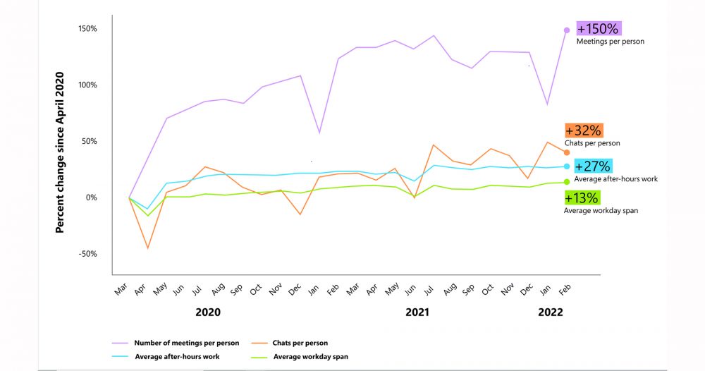 하이브리드 업무 지속을 위한 새로운 근무시간 기준 설정 필요성도 제안됐다. 마이크로소프트 365의 생산성 트렌드에 따르면, 비대면 회의와 채팅 횟수가 늘어나는 만큼, 초과근무 시간도 비례해 증가한 것으로 조사됐다. 2020년 3월 이후 협업 플랫폼 팀즈(Teams) 사용자가 일주일간 회의에 할애하는 시간은 252%나 증가했으며, 시간외 근무는 28%, 주말근무는 14% 늘었다.