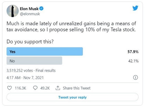 투자자들은 이러한 머스크의 트윗에 이은 주식 매각 때문에 테슬라 주가가 25%가 폭락했고, 결국 테슬라 투자자들이 막대한 피해를 입었다며 고소에 나섰다. 실제 머스크의 트윗에 57.9%가 주식 매각을 찬성했고 머스크는 실제로 주식을 팔기 시작해 17일까지 총 140억달러(약 1조 6300억원)의 주식 1290만주를 수차례에 걸쳐 매각했다. 이후 테슬라의 주가는 전고점인 1229달러 대비 25%가 폭락했다.