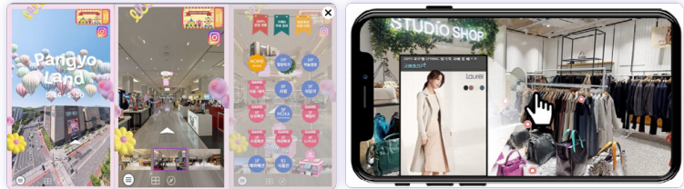 ‘핑거쇼핑’과 ‘VR판교랜드’는 제품을 360도로 자세히 줘서 고객의 제품 이해를 도울 뿐만 아니라 매장에 온 것 같은 현실감을 제공한다. 특히 상담부터 상품 감상, 구매 등 오프라인에서 진행하는 모든 쇼핑 행위가 가능하다는 점에서, 이 두 플랫폼은 ‘가상과 현실이 연결된 공간’ 이라는 메타버스의 기본 개념을 충실히 반영한 사례로 볼 수 있다.