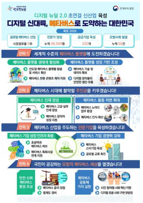 2026년 이룩하고자 하는 목표는 다음과 같다. 시장점유율 5위권 진입, 메타버스 전문가로 누적 4만여 명 양성, 여기에 메타버스 공급기업 200여 개 육성 등이다. 현실 세계를 마치 거울처럼 반영한 메타버스 일상생활 실현을 시작으로 메타버스 관광이나 메타버스 문화예술로 도서 간 문화 격차 해소, 교육이나 의료, 미디어에 이르기까지 다양한 플랫폼을 추구할 예정이라고 한다.
