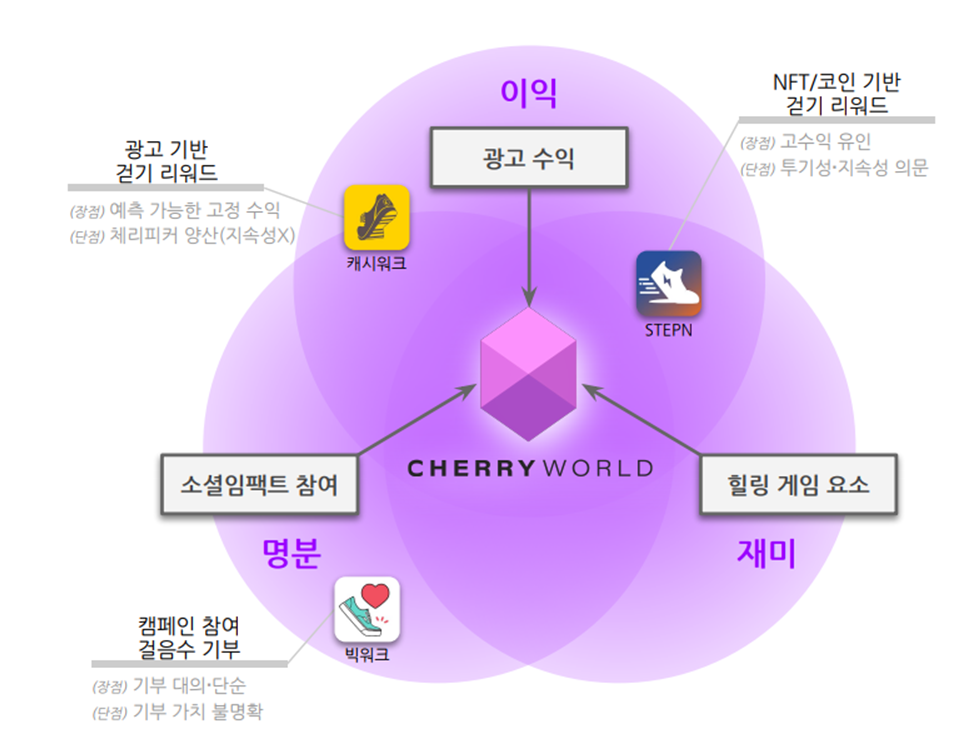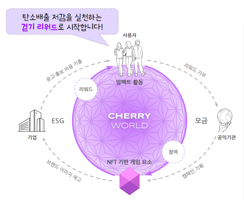 “우선 사용자들은 비교적 쉽게 참여할 수 있는 소셜 임팩트 활동에 대한 리워드를 갖습니다. 여기에 NFT 기반 게임 요소를 지속 가능한 동기 부여 장치로 도입하는 거죠. 즉 체리월드라는 가상공원을 설정해 사용자들이 디지털 경험을 지속적으로 획득할 수 있게 하고 이 활동을 지원하는 기업들의 ESG 관련 비용이 기부로 연결되게 하는 방식입니다. 사용자들이 직접적으로 기부금을 내게 하는 방식이 아닌 리워드 등을 통한 지속적인 활동 자체가 기부행위가 되도록 하는 거죠.”