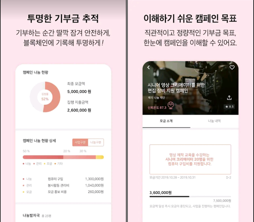 2년 8개월이 지난 현재 체리 플랫폼은 290여개의 기부 단체가 등록돼 있고, 1400여개의 캠페인이 진행됐다. 누적 기부금은 50억원에 육박한다. 비결은 체리 플랫폼에 적용한 블록체인 기술 덕분이었다. 기부금의 모금에서 사용의 마지막 단계까지 마이크로 트레킹 기능을 통해 모두 투명화했고 이는 곧 MZ세대의 뜨거운 기부 열기로 이어졌다. 현재 체리의 최대 개인 후원자 5명 중 4명은 MZ세대며 1위는 90년대 생들이 차지하고 있다.