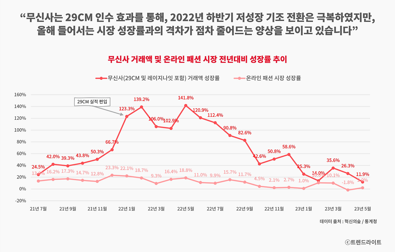 우선 시장 저성장 기조가 장기화되어가고 있고, 이에 따라 무신사의 성장 둔화 우려도 더욱 커지고 있습니다. 물론 무신사가 혁신의숲 데이터 기준으로 상반기에만 여전히 20% 가까이 성장 중이며, 7월 초 진행된 무진장 블랙 프라이데이가 누적 1,400억 원 판매고를 달성하며 전년 대비 2배 이상 증가하긴 했지만요. 3조 원 중반대의 기업 가치에 걸맞은 성장성을 보여주려면 이보다 더 달려야 할 필요가 있습니다.