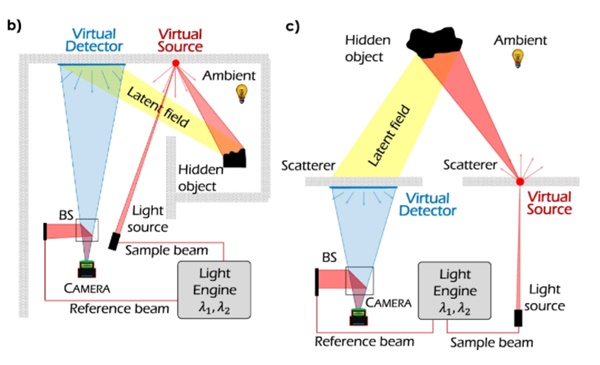 노스웨스턴대 팀은 이른바 가상 검출기를 사용해 숨겨진 물체의 빛을 간접적으로 산란시킨 후 이를 다시 카메라에 산란시켰다. 그런 다음 인공지능(AI)으로 이 광신호를 원래 물체 형태의 홀로그램으로 재구성했다.