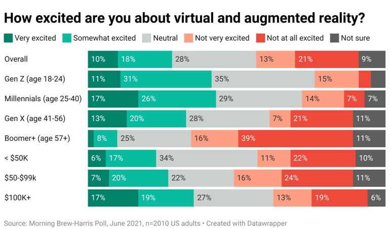 이머징 테크 브루(Emerging Tech Brew)와 해리스 폴(Harris Poll)이 가상 현실(VR)과 증강 현실(AR) 장치에 대한 설문 조사 결과를 발표했다. 이번 조사는 이머징 테크 브루 구독자를 대상으로 한 것으로 디지털 기술에 관심이 많은 이용자를 대상으로 한 것이다.