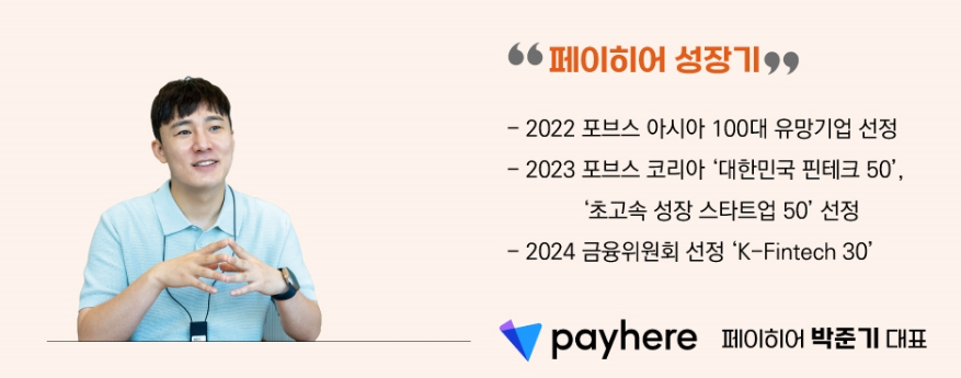 소프트웨어 엔지니어 출신의 박준기 대표가 지난 2019년 창업한 페이히어 6년의 스토리는 놀랍다. 2023년 포브스코리아 ‘대한민국 핀테크 50’ ‘초고속 성장 스타트업 50’ 선정, 지난해 금융위원회 ‘K-Fintech 30’에도 선정되며 업계의 주목을 받은 페이히어는 지난해 여름 150억원 규모의 시리즈B2 투자 유치에 성공하며 누적 투자 유치액 500억원을 넘긴 상황. 2020년 1억3000만원으로 시작된 매출은 이미 지난 2023년 110억원을 돌파하며 꾸준히 상승하고 있다.