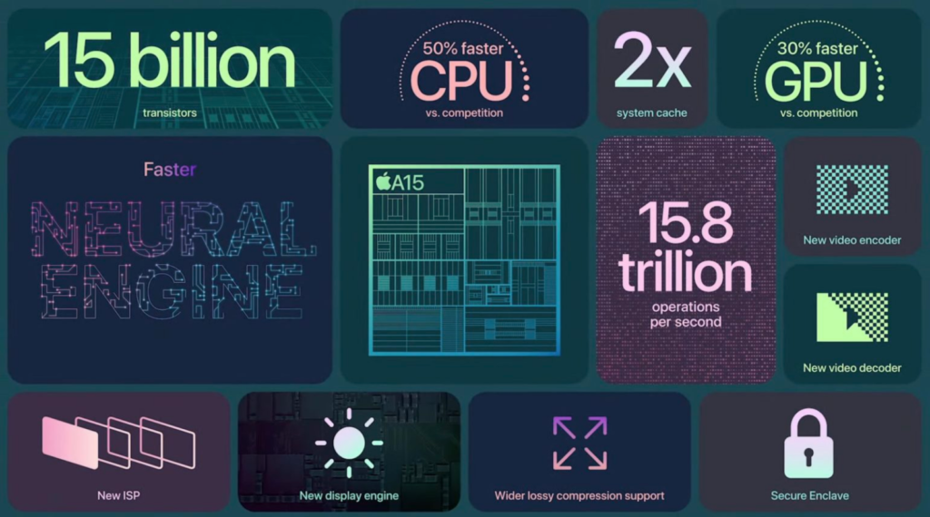 새로운 AP인 A15 바이오닉 탑재...애플 "경쟁사 대비 50% CPU 빨라"