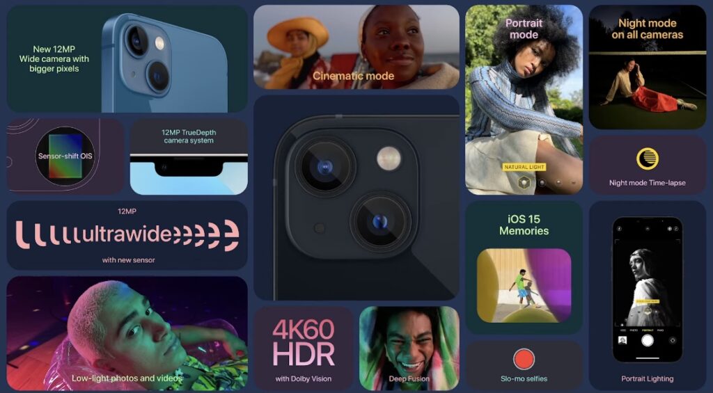 아이폰13은 A15 바이오닉칩과 뉴럴엔진 코어 강화로 카메라 촬영 기능이 향상됐다. 카메라 시스템은 아이폰12시리즈와 같이 망원, 광각, 초광각 등 3개 카메라를 탑재했으나, 와이드 카메라 센서는 이전보다 47% 더 많은 빛을 잡아낸다. '센서 시프트 OIS 기술 역시 모든 라인에 적용됐다. OIS(Optical Image Stabilization)는 손 떨림이나 렌즈의 흔들림을 인식해 안정적인 사진 촬영을 지원한다. 다만, 애플의 사진 저장용 포맷 프로로우(ProRAW) 기능은 이전과 같이 프로 라인업에만 적용된다.