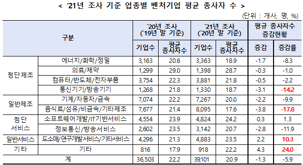 업종별로는 소프트웨어(SW)개발·정보기술(IT)기반서비스에서 매출액이 전년 대비 26.1% 늘어나 가장 많이 증가했다. 또 벤처기업의 매출액 대비 연구개발비 비율은 4.4%로 대기업(1.8%) 대비 2.4배 높았다.