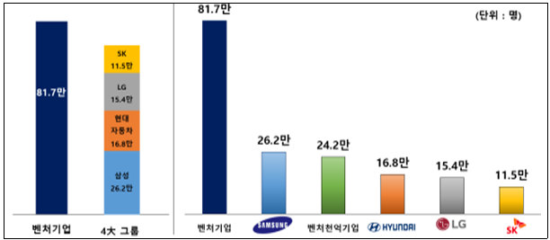 지난해 말 기준으로 국내 벤처기업 종사자 수는 약 81만7천명으로, 이른바 4대 그룹인 삼성·현대차·LG·SK보다 약 11만9천명 많은 것으로 나타났다.