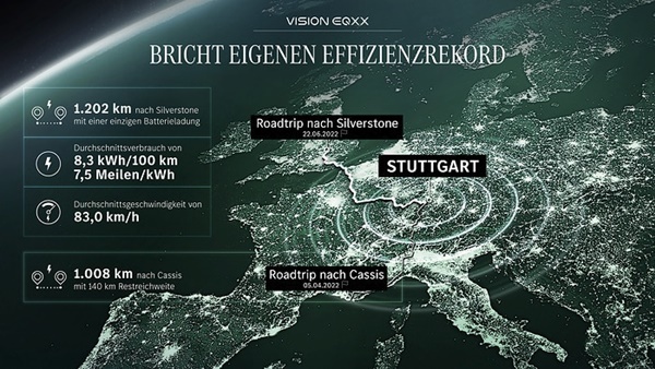 1202km를 주행한 메르세데스 벤츠 비전 EQXX은 이미 지난 4월 메르세데스의 신델핑겐 공장에서 프랑스 카시스의 코트다쥐르까지 알프스 산맥을 통과하는 621마일(1000km)의 여행을 마쳤다.