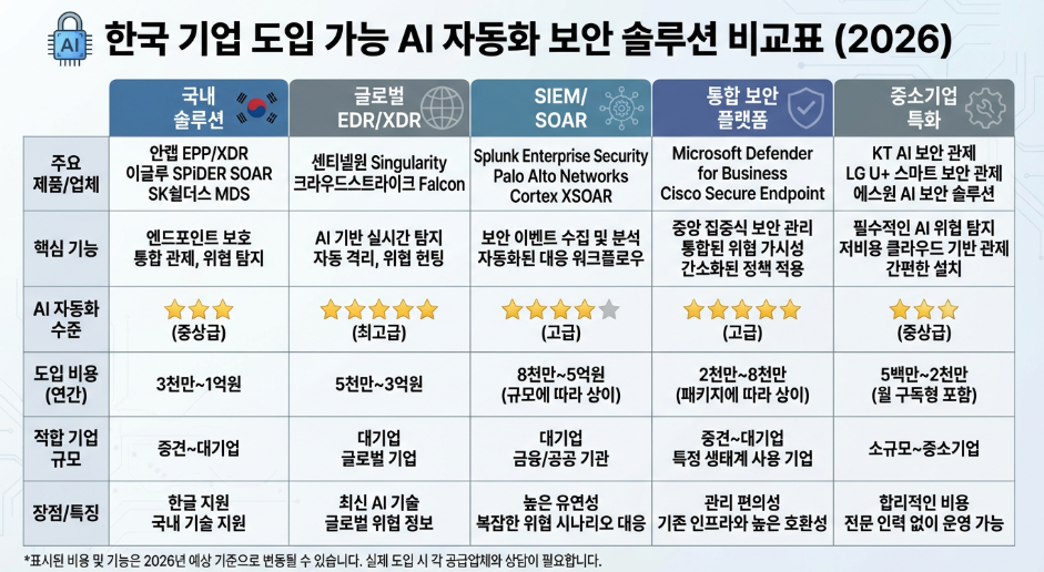 현재 도입 가능한 AI 자동화 보안 솔루션 비교. (사진=생성형 AI)