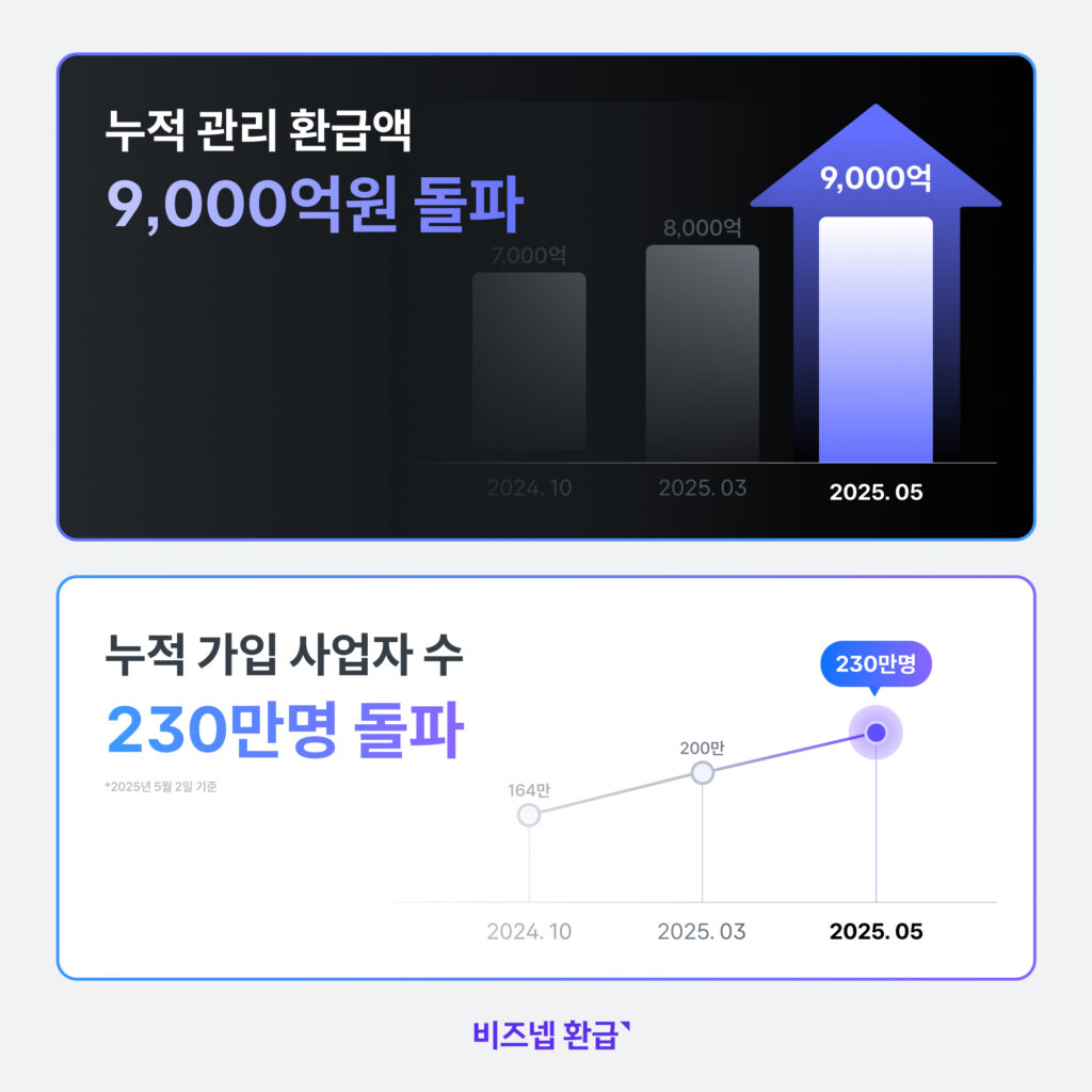 비즈넵(운영사 지엔터프라이즈)은 누적 관리 환급액 9000억원을 돌파했으며, 누적 가입 사업자 수는 230만명을 넘어섰다고 8일 밝혔다. 이는 2022년 9월 비즈넵 환급 출시 후 약 2년 8개월 만에 달성한 성과다.