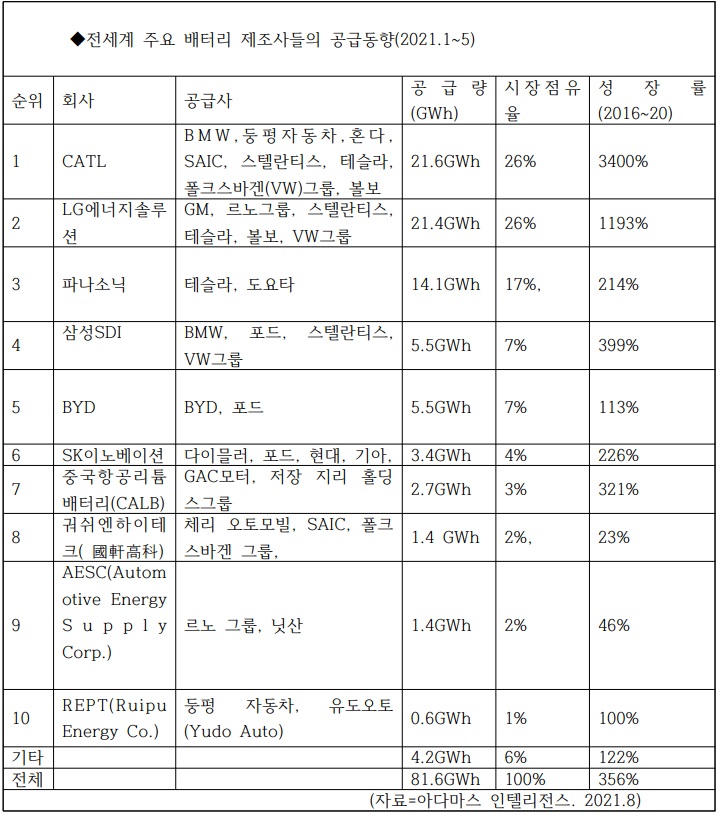 지난해 하반기 전기차 배터리와 금속 공급량의 89%를 차지한 것은 단 6개 회사였다. 이들은 중국 2개사(CATL, BYD), 우리나라 3개사(LG에너지솔루션, 삼성SDI, SK이노베이션), 일본 1개사(파나소닉)다.