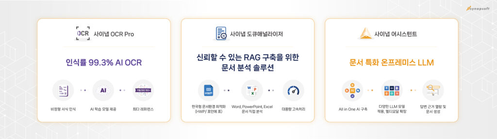 이번에 공개될 제품군은 크게 세 가지 영역으로 구성된다. 먼저 고속 문서 분석 엔진 '도큐애널라이저'는 마이크로소프트 오피스와 한글과컴퓨터의 아래아한글 파일을 PDF로 변환하지 않고 바로 처리하는 것이 특징이다. 대규모 문서 더미도 빠르게 처리할 수 있어, 거대언어모델(LLM) 학습 데이터 준비 시간을 크게 단축시킨다는 것이 회사 측 설명이다.