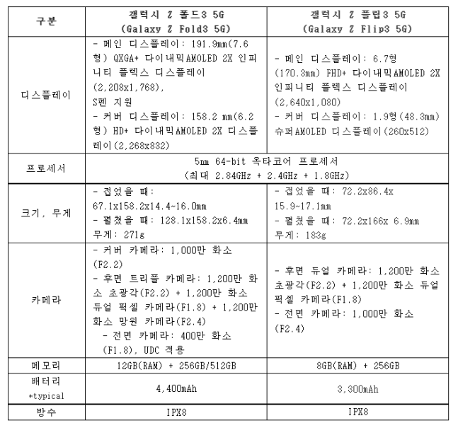 갤럭시 Z 폴드3와 갤럭시 Z 플립3의 주요 사양. (자료=삼성전자)