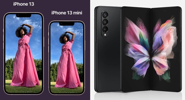 ▲애플이 이번 분기에 삼성을 제치고 세계 스마트폰 시장 1위를 차지할 것으로 예상됐다. 애플 아이폰13(왼쪽)과 삼성 갤럭시Z폴드3 5G. (사진=애플, 삼성)