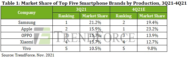 트렌드포스의 추계에 따르면 애플은 2분기 중 13.7%의 시장 점유율로 세계 4위였지만 3분기에는 아이폰13 시리즈에 힘입어 2위에 올랐다. 애플은 3분기에 약 16%의 점유율로 세계 스마트폰 2위를 기록했으나 이번 분기에는 더 나아가 삼성을 추월할 것으로 예상된다. 애플은 내년 1분기에 3세대 아이폰SE를 출시할 것으로 알려지고 있으며 이는 중급 5G 스마트폰 부문에서 시장 점유율을 확보하는 데 도움이 될 것으로 보인다.