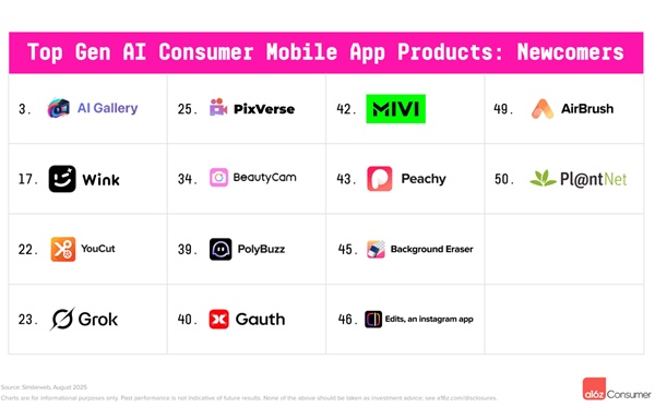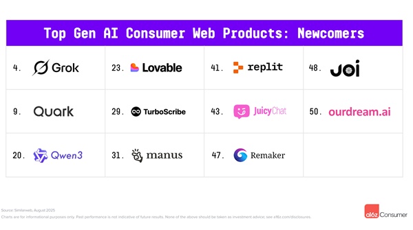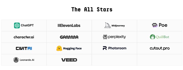 14개 올스타기업들은 AI를 활용한 소비자 행동의 진정한 단면을 보여준다. 일반 지원(챗GPT, 퍼플렉시티, 포우e); 동반자 관계(캐릭터 AI); 이미지 생성(미드저니, 레오나르도); 이미지 및 비디오 편집(비드, 컷아웃); 음성 생성(일레븐 랩스); 생산성 도구(포토룸, 감마, 퀼봇); 모델 호스팅(씨비타이, 허깅 페이스)였다.