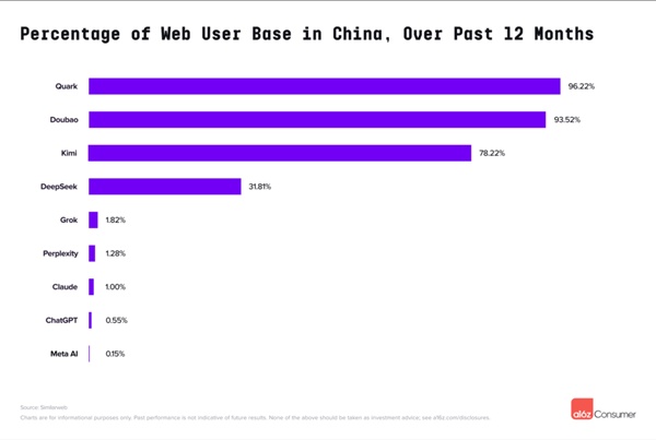 각 회사는 중국어 웹사이트를 운영하며 트래픽의 75% 이상이 중국에서 발생한다. 여기에는 알리바바의 올인원 AI AI 비서인 쿼크(Quark 모바일 순위 47위), 바이트댄스의 일반 LLM 제품인 두오바오(Doubao 모바일 순위 4위), 그리고 스타트업 문샷 AI의 챗봇인 키미(Kimi 모바일 순위 17위)가 포함됐다.