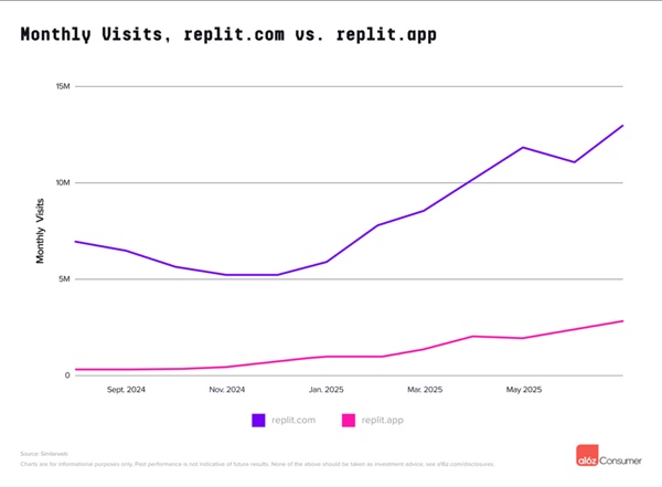 이 플랫폼들은 또한 다른 AI 제품 사용을 촉진하고 있다. 바이브 코딩 AI인 리플릿(Replit)을 통해 구축되고 게시된 사이트와 역시 바이브코딩 AI인 러버블(Lovable)을 통해 각각 ‘replit.app’과 ‘lovable.app’이 트래픽을 받고 있다.