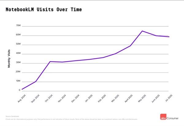 AI스튜디오에 이어 13위를 차지한 노트북LM은 구글 랩스의 일부로 출시된 후 현재는 독립 웹사이트로 운영되고 있다. 검색 및 노트받아적기 비서인 노트북LM은 약 1년 전에 처음 입소문을 탔으며, 그 이후로 꾸준히 성장해 왔다. 여름 동안 약간의 하락세를 보였지만 이는 아마도 학계 사용자들이 일시적으로 이탈했을 때였을 것이다.