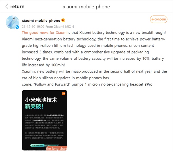 ▲샤오미가 지난 10일 더 작은 공간에 더 많은 배터리 전력을 공급할 수 있는 새로운 배터리 기술 돌파구를 열었다고 웨이보를 통해 발표했다. (사진=웨이보)
