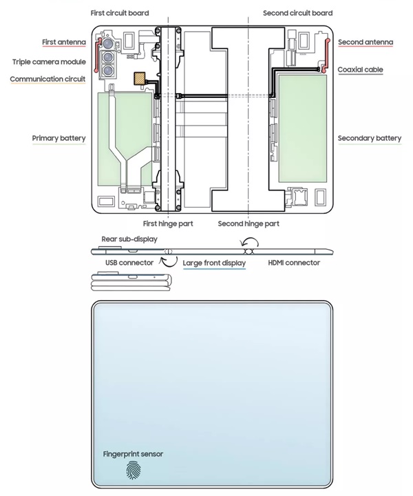 삼성의 특허받은 스마트폰은 TCL이 2019년에 선보인 이중 힌지 시제품처럼 Z자 모양으로 닫히는 단말기다. 즉, 3개의 메인 디스플레이 중 하나가 전화기를 닫은 상태에서 외부 스크린으로 이중화된다. 외부 디스플레이에는 화면 내 지문 센서가 있으며, 후면에는 트리플 카메라가 배치된다.