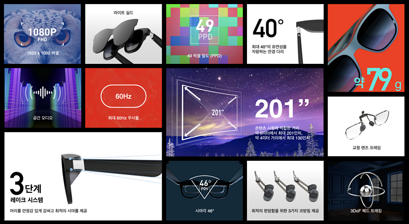 엔리얼 에어는 AR 모드를 통해 영상, 게임 등의 콘텐츠를 200인치급 대형 3D 스크린으로 즐길 수 있는 AR글래스 제품이다. 최대 201인치의 고해상도 디스플레이와 고품질 오디오는 사용자의 몰입도를 높여준다.