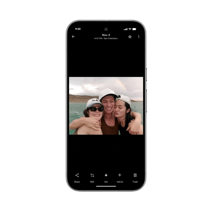 새롭게 추가된 'Ask' 버튼 기능도 주목할 만하다. 사진을 보는 중에 'Ask' 버튼을 탭하면 해당 이미지의 내용에 대해 즉시 답변을 받거나, 관련 순간을 발견하거나, 원하는 편집 사항을 설명해 몇 초 만에 변경사항을 확인할 수 있다. 제안 칩을 활용하거나 직접 타이핑해 대화를 시작할 수 있다.