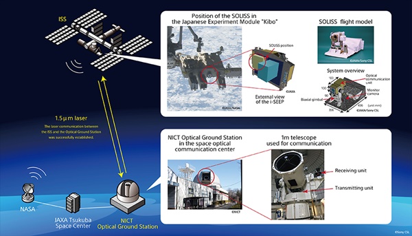 지난 2020년 4월 소니는 우주 저궤도 ISS에 탑재한 솔리스 통신 장치와 일본에 있는 광지상국을 연결해 고화질(HD) 영상 데이터를 (양방향 이더넷 링크로) 세계 최초로 수신하는 데 성공했다고 발표했다. (NICT 광 지상국은 우주통신 관련 기술 개발을 위해 설치된 망원경 시설이다. 총 4개의 망원경으로 구성돼 있다. 도쿄 가고네이에 있는 렌즈 구경 1.0m와 1.5m인 망원경, 이바라키 가시마에 있는 1.0m 망원경, 오키나와 구니가미군 온나에 있는 1.0m망원경이 그것이다.)