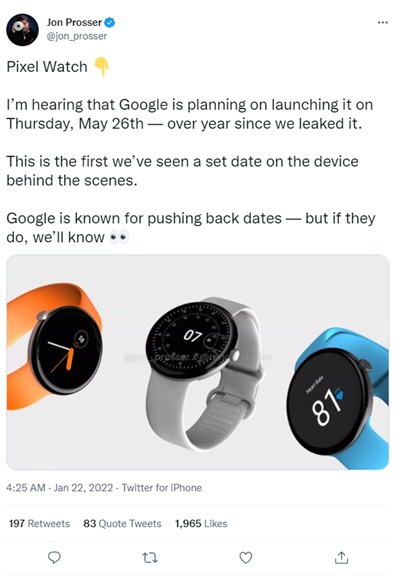 GSM아레나·기즈차이나 등은 유명 제품정보 유출자 존 프로서를 인용, 구글 최초의 픽셀 워치가 마침내 5월 26일에 첫 선을 보일 것이고 전했다.