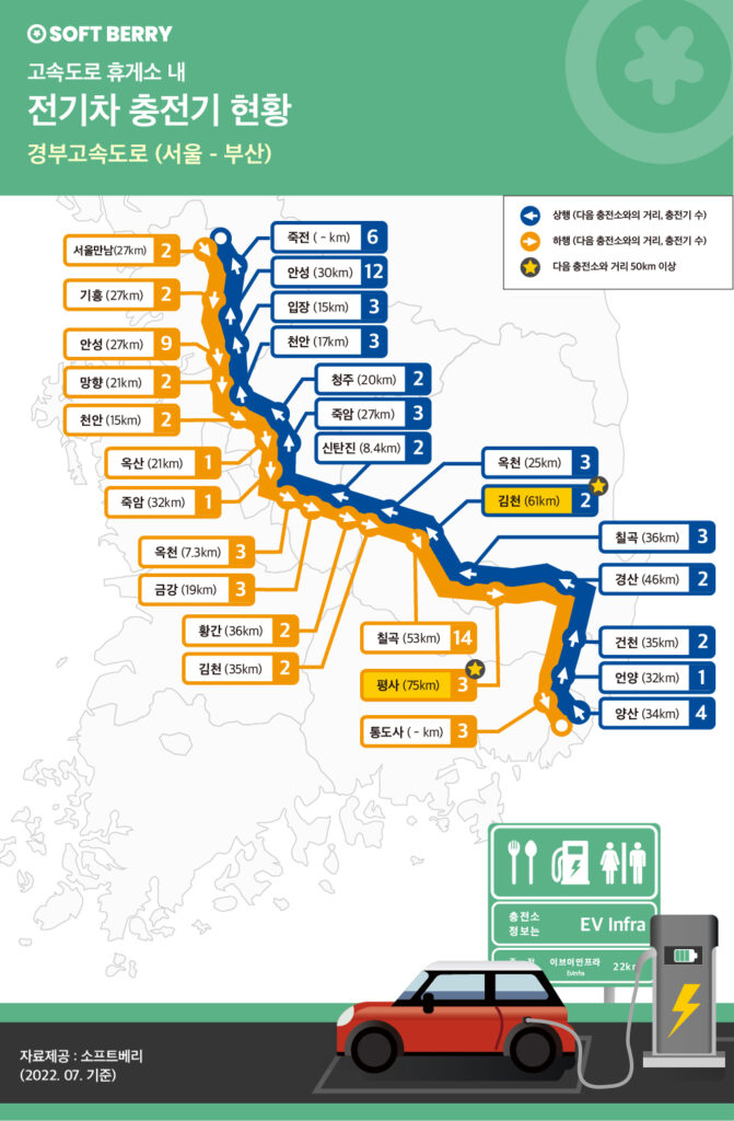 소프트베리는 자사의 앱 'EV 인프라(EVInfra)' 사용자 데이터를 분석해 장거리 교통량이 가장 많은 경부고속도로, 영동고속도로, 중앙고속도로의 전기차 충전이 가능한 다음 휴게소까지의 거리와 휴게소 내 전기차 충전기 대수를 공개했다.
