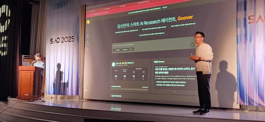 SAC 2025의 첫 발표는 솔트룩스 이경일 대표가 직접 연단에 올라 “AI 에이전트가 세상을 집어삼키다”라는 선언적 메시지로 문을 열며 구버(Goover)의 기능을 소개하는 것으로 시작됐다.