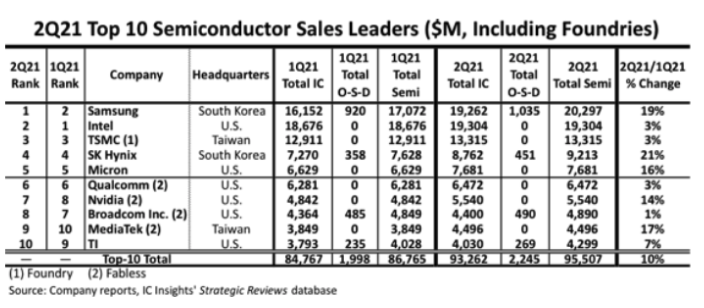 만약 엔비디아가 ARM을 인수한다면, 반도체 시장은 지각 변동이 일어날 것으로 예상된다. 반도체 시장조사업테 IC인사이트에 따르면, 2021년 2분기 반도체 시장 1위는 삼성전자로 인텔, TSMC와 함께 3강 체제를 유지하고 있다.