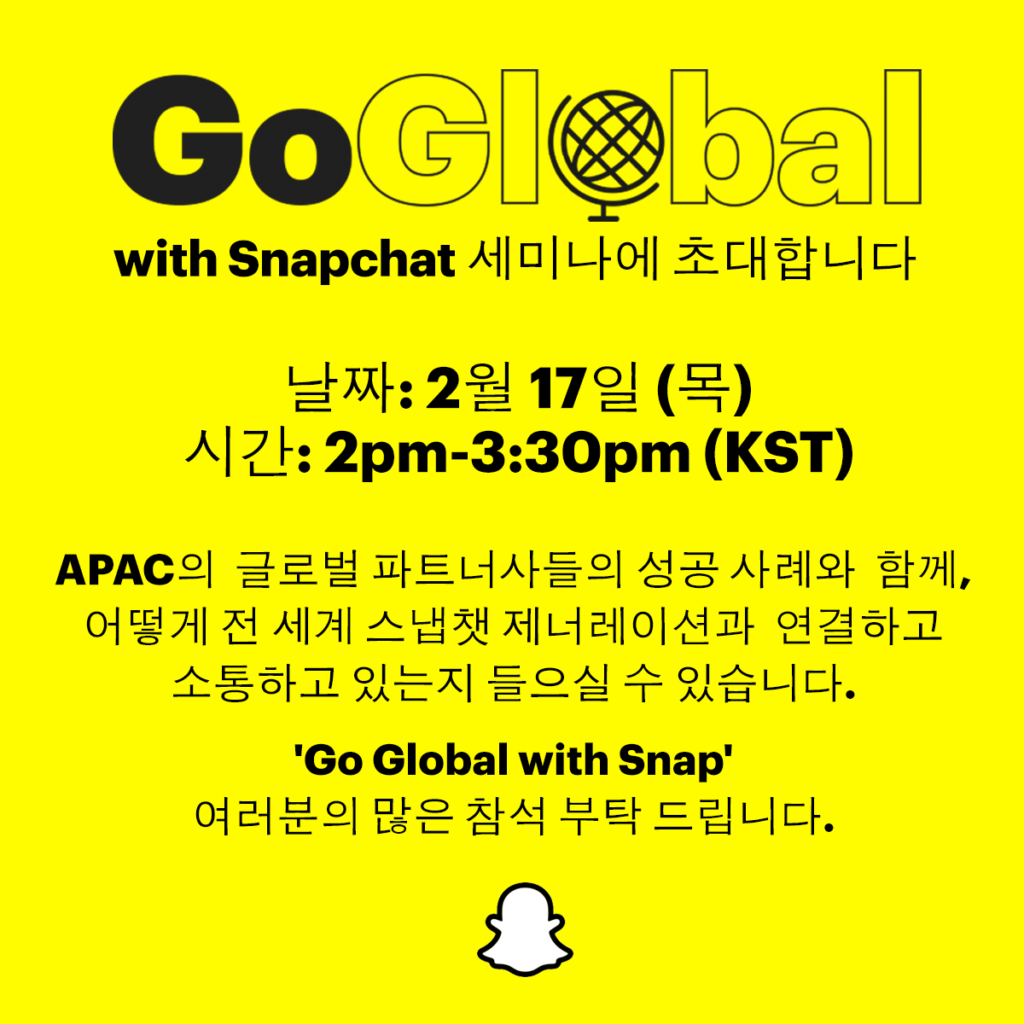 글로벌 숏폼 모바일 비디오 플랫폼 스냅챗이 버추얼 세미나를 진행한다. 'Go Global with Snapchat 서밋'이라는 이름으로 오는 17일 오후 2시부터 90분간 온라인으로 펼쳐질 예정이다. 이번 행사는 글로벌 플랫폼인 스냅챗 가이드 투어, AR 전략 및 스냅챗 글로벌 성공 사례가 공유된다.
