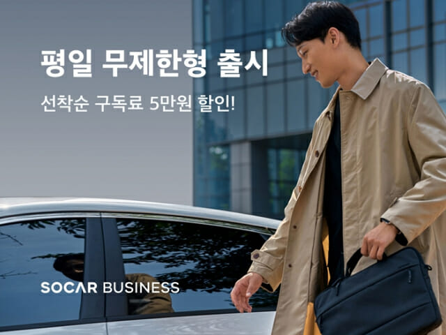 쏘카는 업무 이동용 카셰어링 구독 상품인 쏘카 비즈니스 멤버십 ‘평일 무제한형’을 출시한다. 매월 일정 구독료를 지불하면 평일 동안 전국 쏘카 차량을 언제 어디서든 자유롭게 이용할 수 있다.