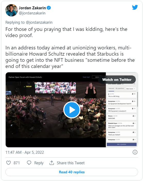 5일(현지시간) 미국 IT 전문미디어 긱와이어는 임시 CEO로 복귀한 하워드 슐츠가 4일 타운홀 미팅을 통해 "올해 안으로 NFT 사업을 할 것" 이라고 발표하는 동영상이 트위터에 게재됐다고 전했다. 또한 해당 동영상은 More Perfect Union의 조던 자카린(Jordan Zakarin) 기자의 트위터 영상이라고 출처를 밝혔다.