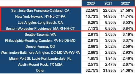 그러나 여기서 주목하지 않으면 안 되는 것은 실제 숫자입니다. 마이애미가 많이 올랐다고 하지만 단지 2.49%에 지나지 않고, 필라델피아도 3.37%입니다. 이 정도의 수준이면, 아무리 성장하고 있다고 해도 전체 시장에 미치는 영향은 상당히 한정적이라고 할 수 있습니다. 반면 미국 스타트업 활동이 가장 활발한 지역인 실리콘밸리, 뉴욕, 로스앤젤레스, 보스턴의 4개 도시는 합쳐서 전체 안건수의 50% 이상, 투자 금액 기준으로는 70% 이상을 차지하고 있습니다. 작년에 이어 실리콘벨리를 포함한 이들 지역의 영향력이 약해졌다고는 할 수 없는 것입니다.