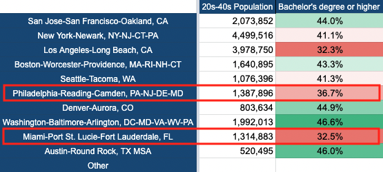 마이애미와 필라델피아와 같은 새로운 지역은 훌륭한 인재에 대한 접근에 대해 큰 과제를 안고 있습니다. 스타트업으로 계속 성장하기 위해서는 우수한 인재 채용은 필수입니다. 하지만 마이애미와 필라델피아는 다른 지역보다 상대적으로 대학 졸업자 비율이 낮습니다. 또한, 특히 마이애미에서는 정상급 대학이 없기 때문에 앞으로의 인재에 대한 접근을 의문시하는 목소리도 많이 있습니다. 요즘은 원격근무가 대세이기 때문에 이 점은 별로 중요하지 않을 수 있지만, 고려해 둘 필요가 있다는 점은 확실합니다.