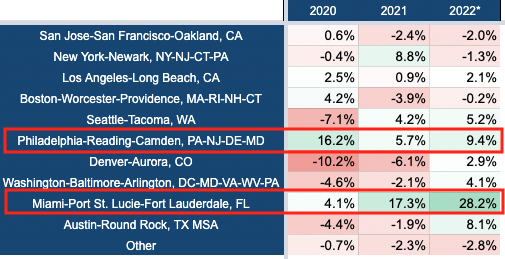 또 다른 흥미 있는 지역은 필라델피아입니다. 마이애미만큼은 아니지만 위 테이블에서 알 수 있듯, 이곳에서도 벤처투자 점유율이 꾸준히 성장하고 있습니다. 피치북은 2021년부터 2022년까지 필라델피아의 점유율이 3.08%에서 3.37%로(9.4% 포인트 상승) 오를 것으로 예측하고 있습니다.