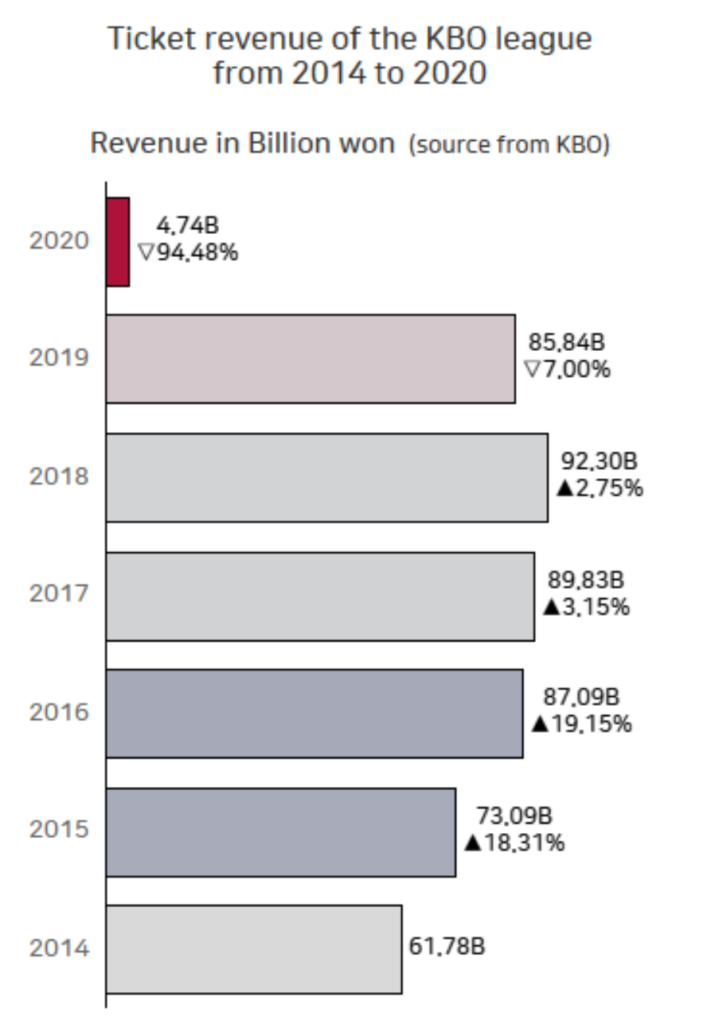 다음은 KBO의 공식 자료를 기반으로 2014 시즌부터 2020시즌까지 유료 관중 수입을 표현한 데이터 시각화입니다. 매년 성장하던 관중 수입은 2018년을 정점으로 2019년에는 전년 대비 7% 하락했고, 코로나 팬데믹으로 뒤늦은 개막과 무관중이 이어진 2020년은 전년 대비 94% 하락이라는 유례를 찾아볼 수 없는 수익 하락을 맞게 됩니다. 2021년에는 이전해 보다는 사정이 나아졌겠지만 방역 수칙 위반으로 인한 리그 중단 및 올림픽 브레이크로 인한 규정 변경 및 올림픽 노메달로 인해 분위기는 예전만큼 못한 것 같습니다.