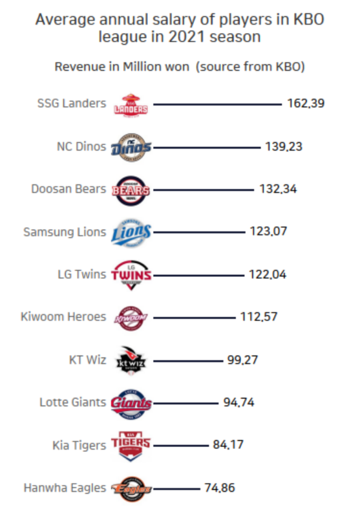 선수 한 명당 평균 연봉이 8~10위인 롯데 자이언츠, 기아 타이거즈, 한화 이글스는 시즌 순위도 동일하게 나왔습니다. 반면에 정규리그 1위인 KT위즈는 평균 연봉 순위는 7위였던 것이 특징입니다.