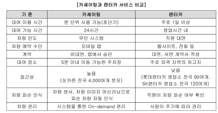 카셰어링과 렌터카 서비스를 비교했을 때 크게 우월한 점이 보이지 않는 게 문제입니다 (출처: 쏘카 증권신고서)