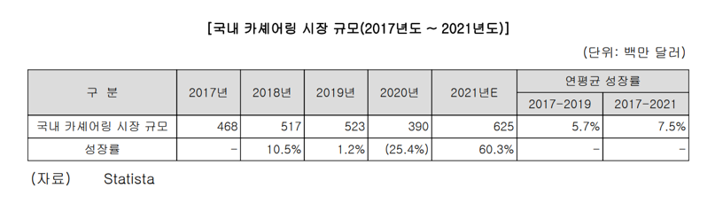 하지만 이와 같이 사실상 카셰어링 시장 그 자체라 할 수 있는 쏘카의 사업 실적이 그리 매력적이지 않다는 건, 곧 그 시장에 무언가 문제가 있다는 뜻 아니겠습니까? 실제로 카셰어링 시장은 꾸준히 성장하곤 있긴 한데 성장률 자체가 시원찮습니다. 연평균 고작 7.5% 성장했으니 말입니다. 매년 적어도 20% 이상씩 성장한 이커머스 시장에 비하면, 정말 초라한 숫자이기도 하지요.